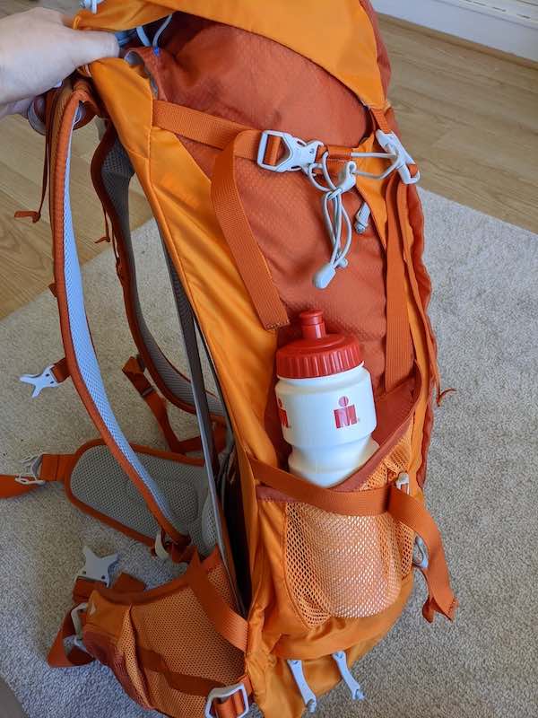 私もそうでしたが、基本的には最初、写真のようなプラスチックボトルやステンレス、アルミボトルに水を入れて、ザックのサイドについているポケットに入れて水分補給をされる方が多いと思います。